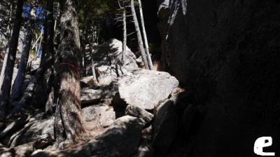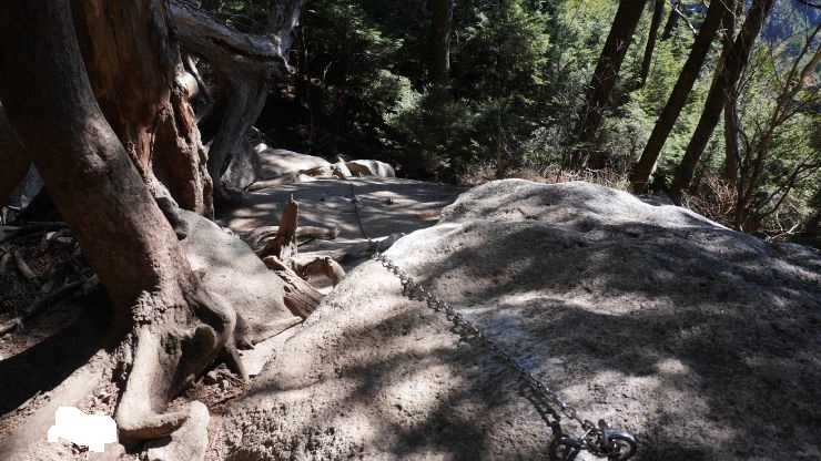 富士見平小屋を越えると対岸の瑞牆山山頂に向けいったん標高を下げる。傾斜がきつく、帰りが心配になる。天鳥川をこえるといよいよこの山の醍醐味といえる場所に。大小さまざまな岩場の急な上りが始まる。途中木の階段やくさり場が数カ所あり、一気に登っていく感じ。ピンクテープはあるが油断するとコースを外してしまいそうな感じもあった。