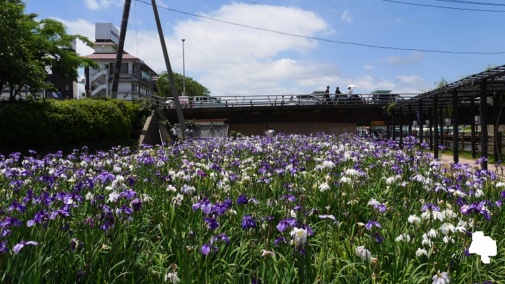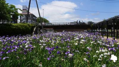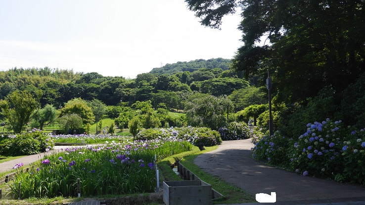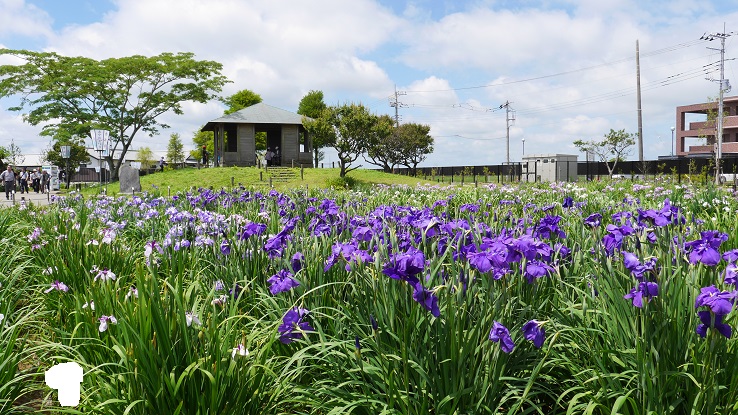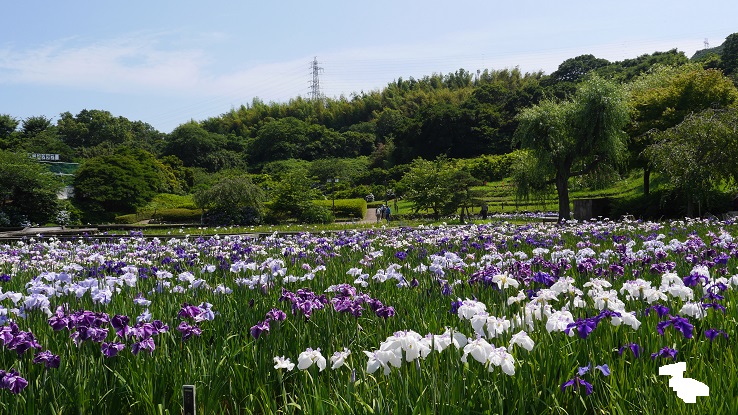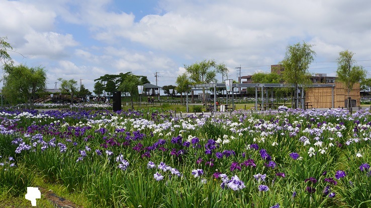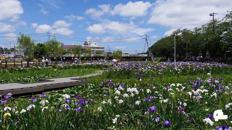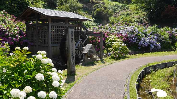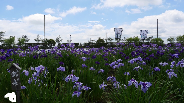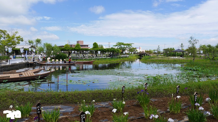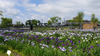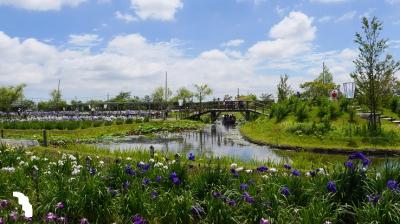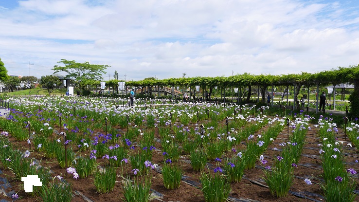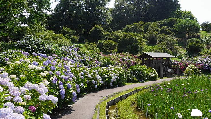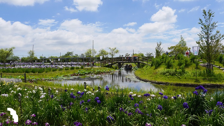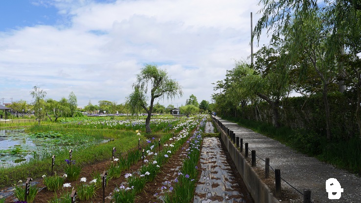 入口を挟んで二手に分かれるしょうぶ田があり敷地は広め。散策路があり小高い丘の上からもしょうぶの広がりを鑑賞することができた。水車が回っているところもなり趣を感じる施設。開花期間中はしょうぶ園発の路線バスが増便されていた。