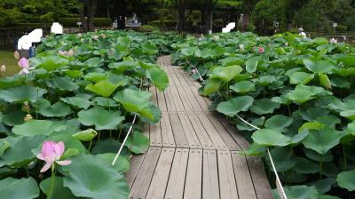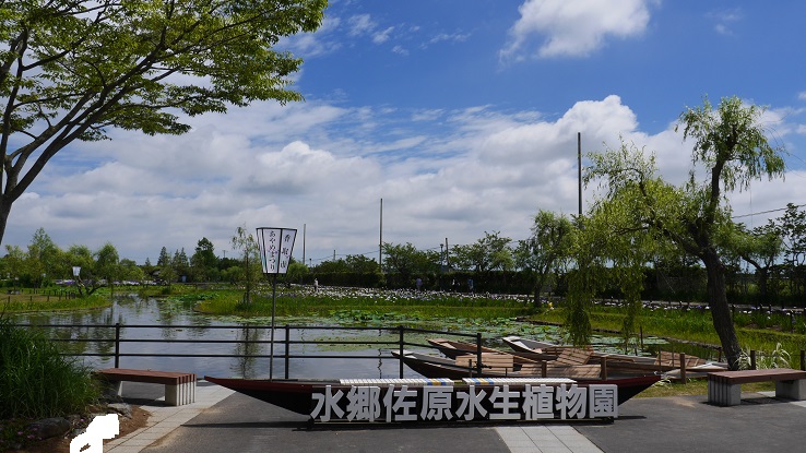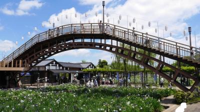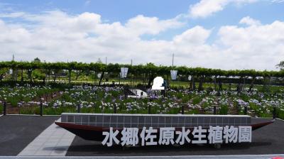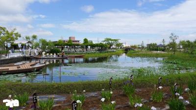 佐原駅前で自転車を借りて進むこと約40分。アヤメ最盛期の水生植物園へ。各しょうぶ田に設けられた菖蒲はちょうど見ごろ。水辺を配置し、小舟から鑑賞できるのもポイント。いろいろな角度からアヤメを鑑賞することができた。
