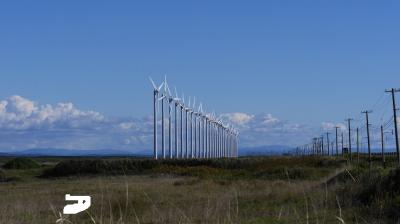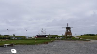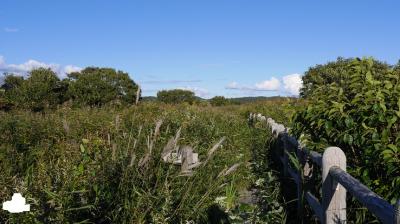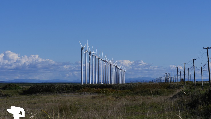 オロロンラインと道道902号がぶつかるあたりから建ち並ぶ風車群。海岸沿いの道路に並行して並ぶ28基の風車群は壮観である。海岸風景と風車風景どちらを見ればよいのか悩むほどの絶景が続く。この風景サロベツ湿原センターの木道や幌延ビジターセンターの展望台などからも遠景を望むことができる。