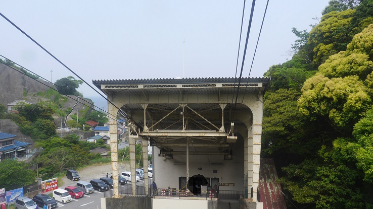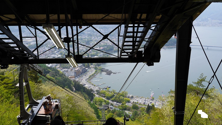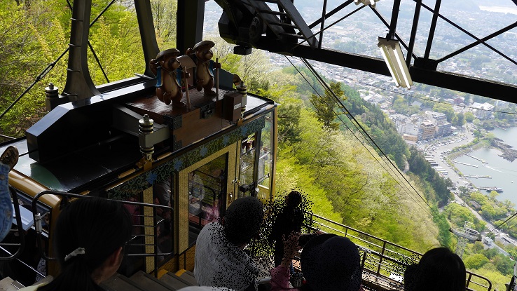 河口湖のほとりにあるロープウェイ。眼下に河口湖、正面に富士山の眺望が見事なはずだったが、訪れた時はなぜがかすんだ天気。クリアな眺望は望めなかった。三つ峠登山道に続いていて、下山ルートでアクセス。ここから三つ峠へは狭い登山道を延々と登りが続くのでちょっとつらそう。だいたいの人はロープウェイ山頂の天上山公園で眺望を楽しんで往復しているようだった。GW期間中は混雑し若干1台見送っての乗車だった。