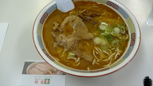 旭川ラーメンの有名店の一つ。醤油ラーメンは個性的なスープが評判との事前情報を得ていたので注文。濃い味と普通を選べるが普通を注文。スープの表面は焦がしラードで黒め。味のほうも・・・焦げの風味が強い。普通でも十分な焦げ風味ということは濃いを注文すれば表面が真っ黒ということか。食後もしばらくは焦げたラードのにおいというか風味が口の中に残る。個人的にはこんな感想だが、ファンは多いようなので自分に合っているかどうか試してほしい。