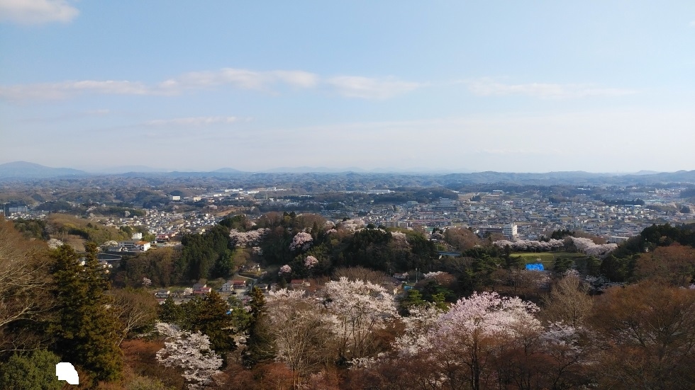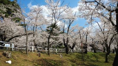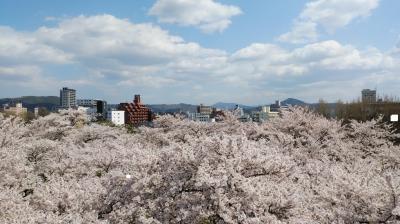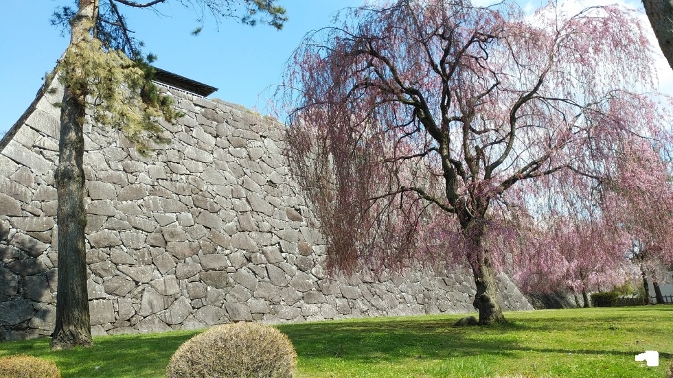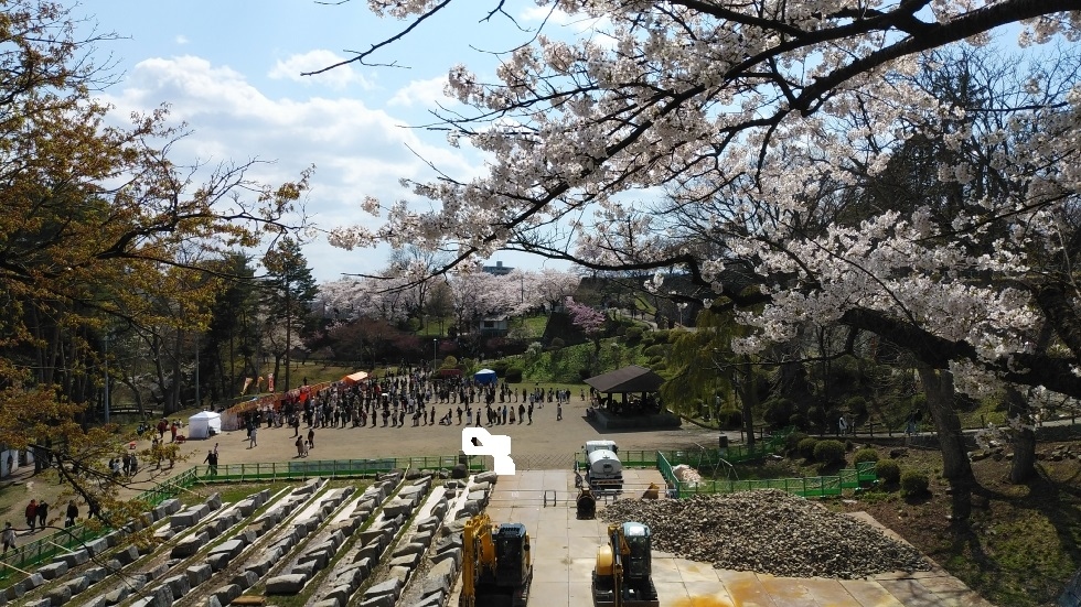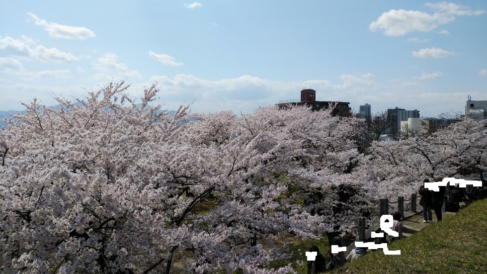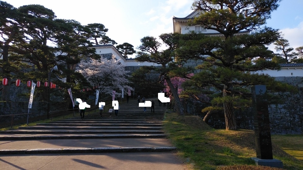現在建物は残されていないが、復元された石垣が高さがあり立派。桜の名所にもなっており、250本の桜が見ごろを迎えていた。花見客も多く、桜のあるエリアは特ににぎわっていた。本丸跡付近の高い位置から眺める桜の花は圧巻。桜まつりを開催中で屋台には長い行列ができていた。- 旅行時期