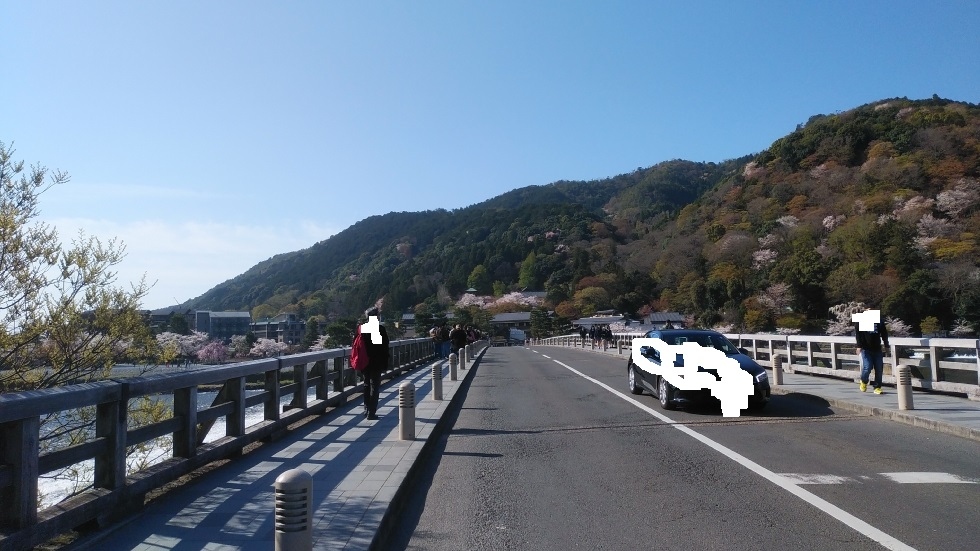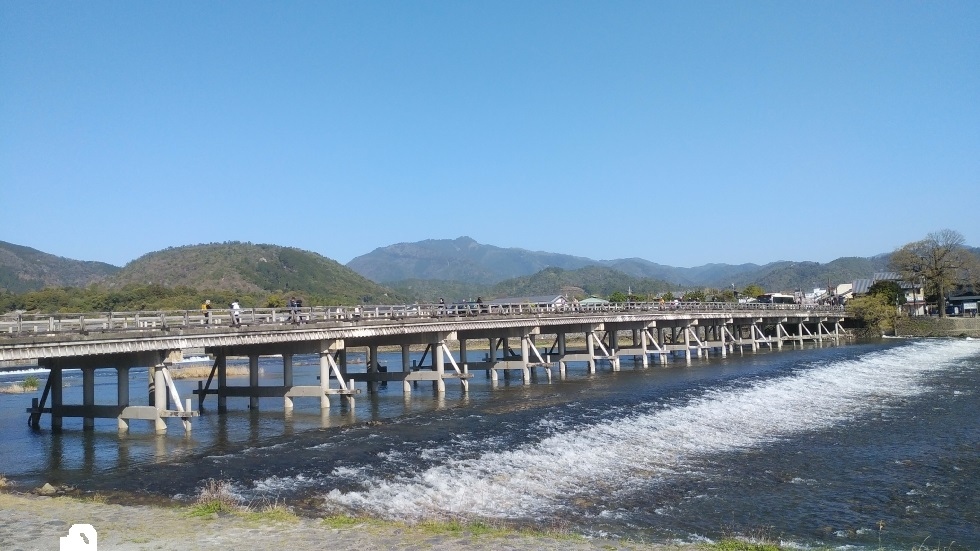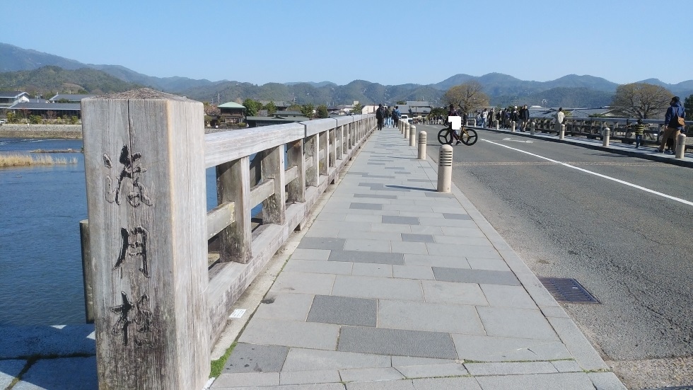 嵯峨嵐山駅から徒歩12分くらいのところにあるスポット。1000年以上の歴史があり、現在の橋は1934年に完成した鉄筋コンクリート桁橋となっている。木製の外観が風情を感じられる橋。朝の早い時間帯から観光客でにぎわっており、昼に向かって混雑が激しくなっていた。