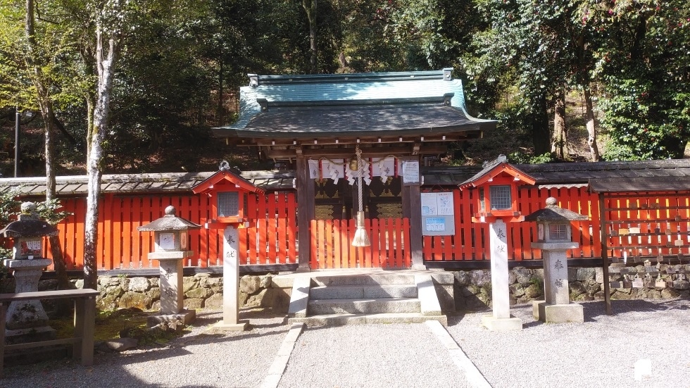 渡月橋のそばの通りに小さな木製の鳥居が建っており、細い砂利道の参道が続いていた。コンパクトでひっそりとした社殿だが、現在までよく管理されているたたずまいだった。- 旅行時期