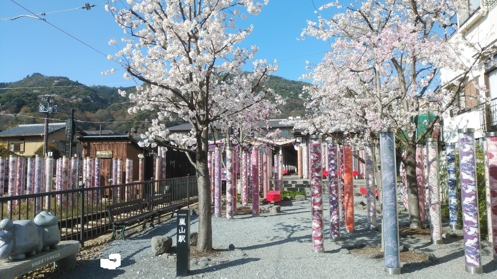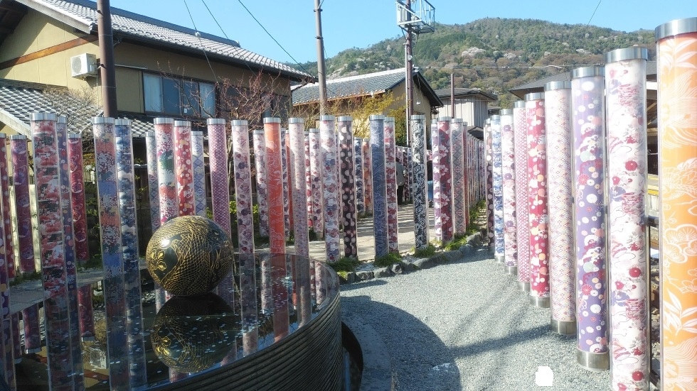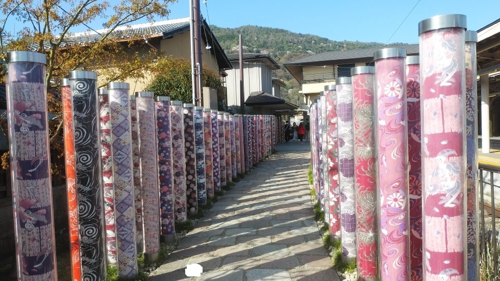 嵐電嵐山駅前にあるスポット。着物柄のポールが数多く建てられており、撮影スポットとして最適。ポールは600本もあるというから、ボリューム感が感じられた。駅前の立地で渡月橋からも近いため、観光客も多く通路としても利用されているので、人の映り込みなく撮影するのは難しかった。