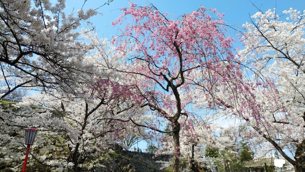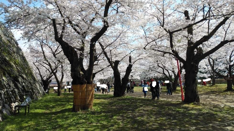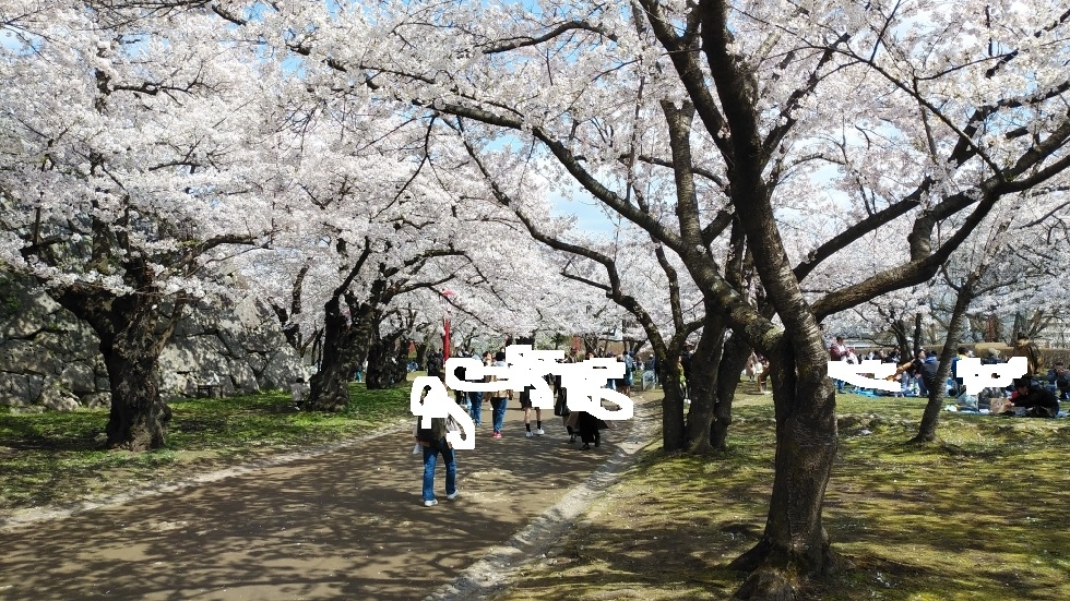 園内には2500本ほどの桜があり、いたるところで楽しむことができた。門や櫓などの復元もあり、城跡としての観光も味わうことができた。- 旅行時期
