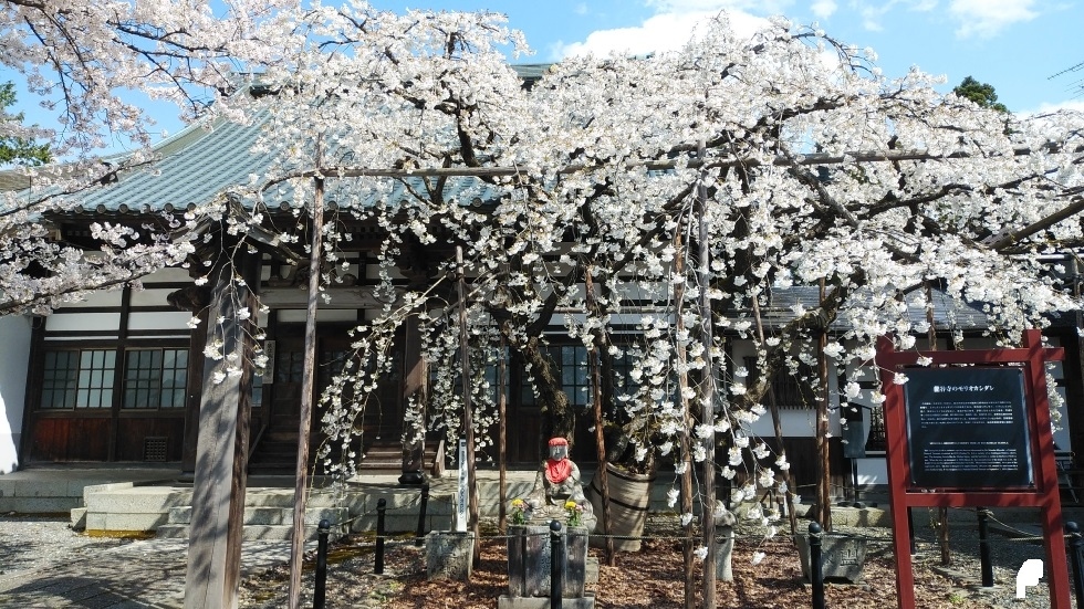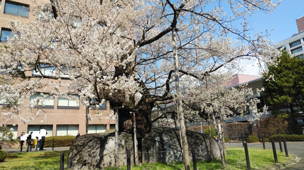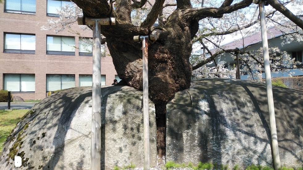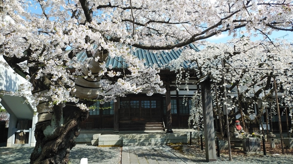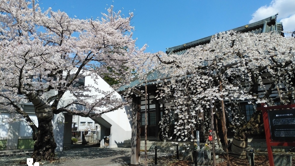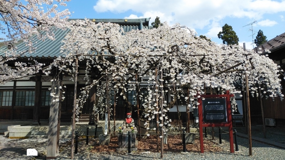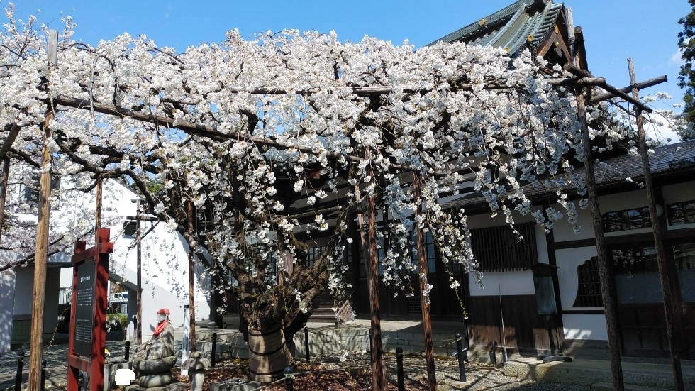 境内にあるしだれ桜は国の天然記念物に指定。ソメイヨシノに並んでおり、同時に楽しむことができた。ソメイヨシノに花や葉等が似ているが、しだれているのが希少品種らしい。花の広がりもシダレならではで美しさを感じた。