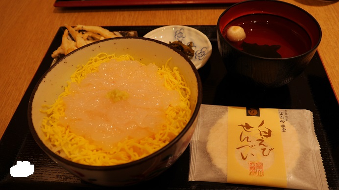 富山といえば白えび。これを気軽に味わうことができるのは駅ビル1階にあるこのお店。昼時は混雑するイメージだったがちょうどタイミングよく並ばず入店。白えび丼は甘みがあって濃い味。素材の味を確かめるべく醤油はつけずに味わった。小鉢に白えびてんぷらや白えび煎餅と白えびづくしのラインナップ。観光向けに印象に残るお店だと思う。