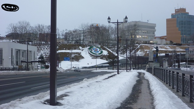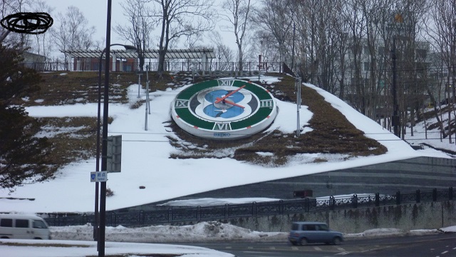 釧路駅か駅から幣舞橋を渡る道路の正面付近に見える大きな時計。花時計だけに雪の無い時期は色とりどりの花が人の目を引き付けてくれる。斜面の高いところに設置されているのでよく目立ってよい。夜間もライトアップされていて、夜間もよい雰囲気だった。