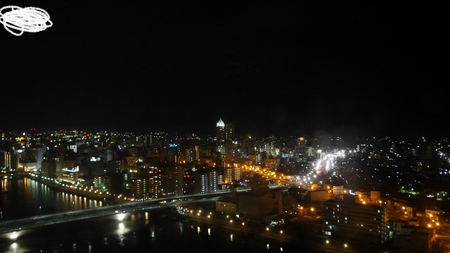 新潟駅前より伸びる大通を進んでいくと萬代橋の手前に新潟日報の大きなビルが見える。ここの上層階が展望施設になっていて、夜間も解放されているため新潟市内の夜景を楽しめる。すぐ真下に信濃川に架かる萬代橋がみられきれいだった。