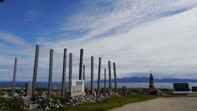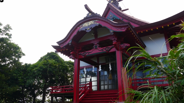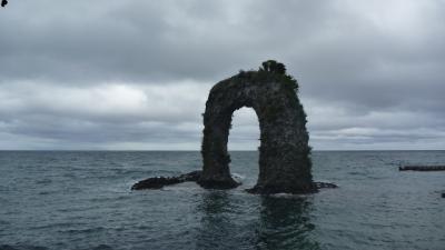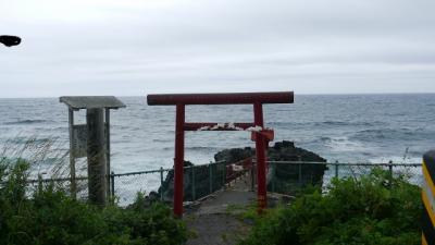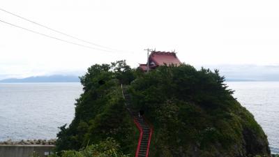 利尻島一周で訪れたポイントの一つ。海岸沿いに鳥居が立ち、海に向かって突き出た岩礁に祠が立っている。かつて嵐で岩に打ち砕かれそうになった弁財船を弁天様が救ってくれたことに感謝し、海の男たちがこの弁天宮を設けたとされる。海の青色に生える赤い色合いが印象的だった。