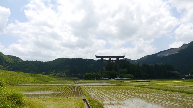 熊野本宮大社のそばの田園地帯にひときわ目立つ大きな鳥居が建っている。鳥居の先に寺社があるわけではなく、ただ鳥居だけがたたずむ姿に不思議に感じるが、ここはかつて本宮大社があったところ。現在の本宮大社よりも規模が大きいものだったらしいが、明治時代の大水害により社殿のほとんどを流出し現在の場所に移設となったとのこと。鳥居の近くによると非常に大きく圧倒させられる。