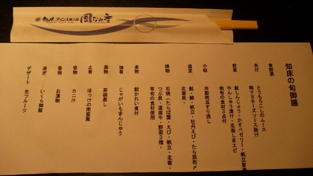 この年まで3年連続夕食が旬彩膳のコースで宿泊。魚介類や斜里町の地物を取り入れた料理に満足していたが、3年続けると個人的にマンネリ感を感じるようになってしまった。とはいえ個室で食事ペースに合わせて料理を提供してくれるのでサービスは十分。温泉も露天風呂は掛け流しで、おそらくウトロの大規模ホテルでは掛け流しは珍しい。客室も新しくはないが清潔感があり、広め。従業員の方も親切でいいホテルだと思う。