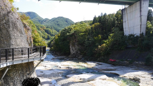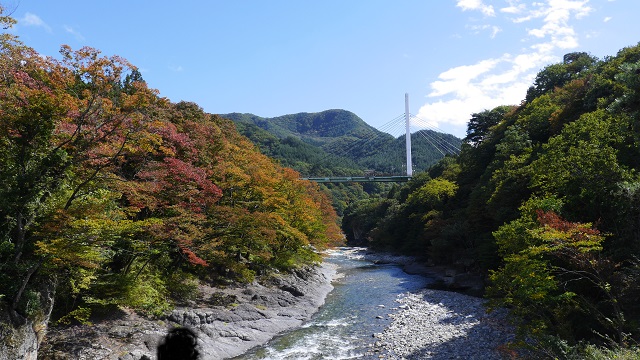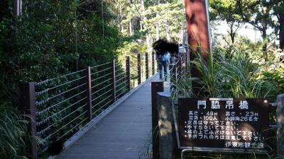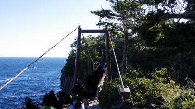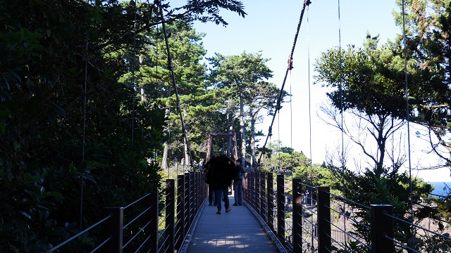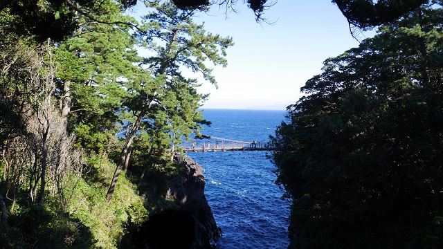 伊豆海洋公園からは歩いて20分くらいのところにある吊り橋。城ケ崎ピクニカルコースの遊歩道上にあり橋の上からは独特な海岸と広大な海が見られる。コースから離れたところからもこの橋を眺めることができ、岩の切れ目に架かる吊り橋の風景もなかなか素晴らしいと感じた。