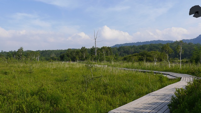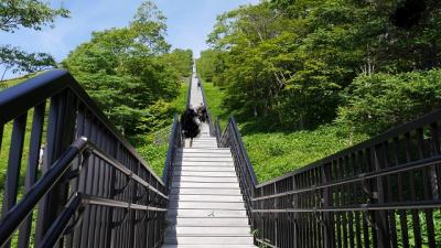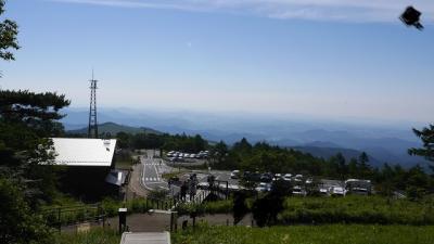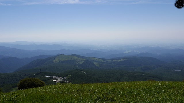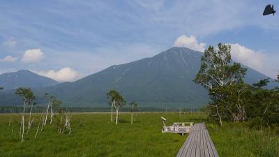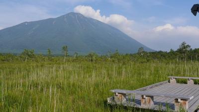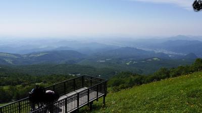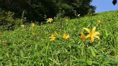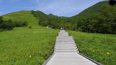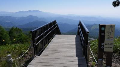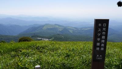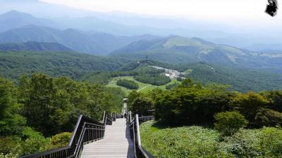霧降高原バス停から階段を上がること約1400段。標高1582mのキスゲ平園地に。6月から7月にかけて、道中の山の斜面にはニッコウキスゲの黄色い花が咲き、なかなかの景色。眼下に広がる山々の景色とともに登ってよかったと思える景色だった。