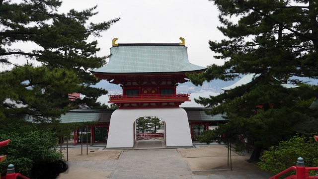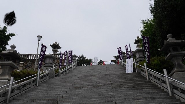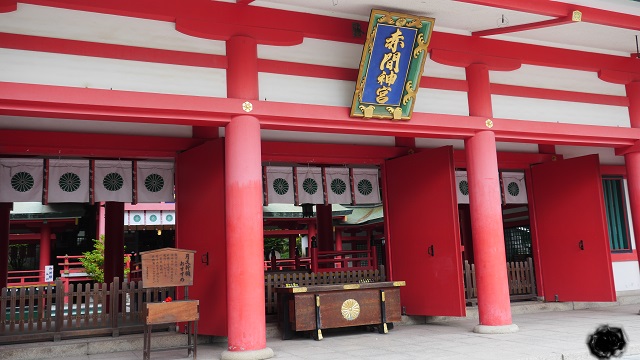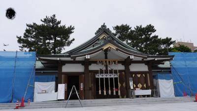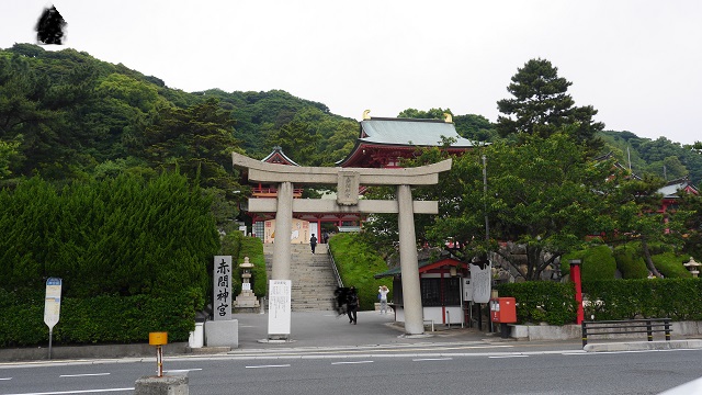 唐戸付近を移動していた時に見かけた神社。大きな鳥居が目を引く。859年創建という歴史ある神社で境内には日本一のふくの像などがある。訪問時は平成の大造営の最中で修復作業を行っているところだった。関門海峡に面し、ロケーションは良い。