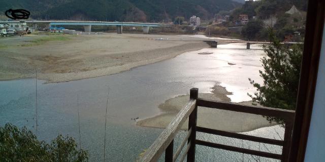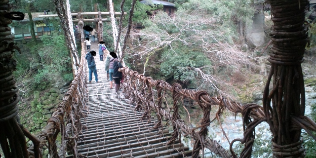 サルナシなどの葛類を使って架けられた原始的な吊り橋だそうで、見た目的には何人も同時に渡れるような頑丈な造りには見えない。料金を払ってわたってみると結構な揺れが、足元を見ると結構な幅の隙間があり下の川が良く見える。高所恐怖症にはかなり堪える橋だったが貴重な体験ができた。