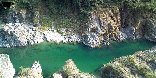 土讃線の車窓のハイライトとも感じられる区間。奇岩が続く川の絶景が続いている。大歩危駅で下車すると道路に沿って、川が続いているのでゆっくりと景色を眺められる。駅徒歩25分位のところに遊覧船乗り場があり、低い目線から絶景を楽しむこともできるようだ。