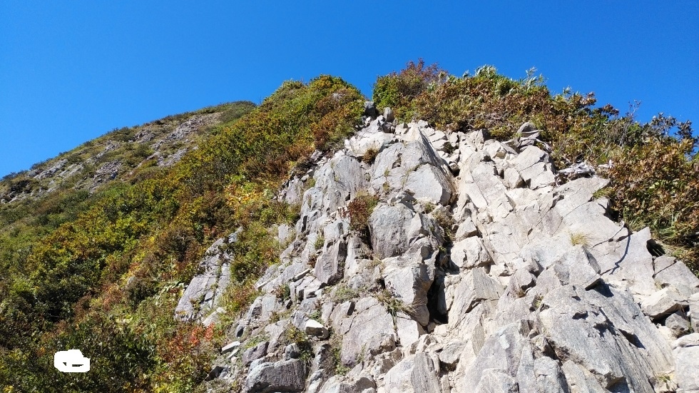 荒菅沢出会を過ぎると本格的な登り。岩もごつく、ひたすら上り続ける印象。徐々に樹林の背丈も低くなり、眺望が開けてくると笹平に到着する。ここから山頂まではおおむね眺望が良くようやく見晴らしの良い登山道となる。