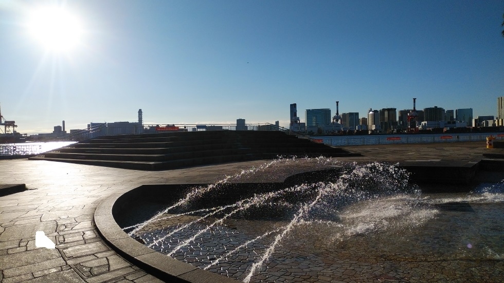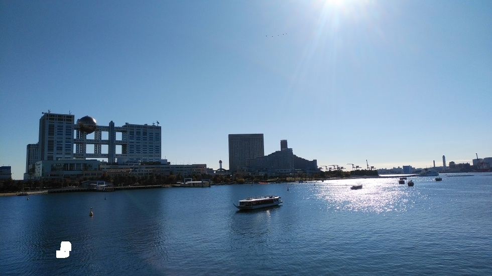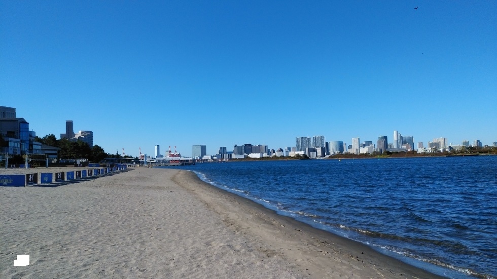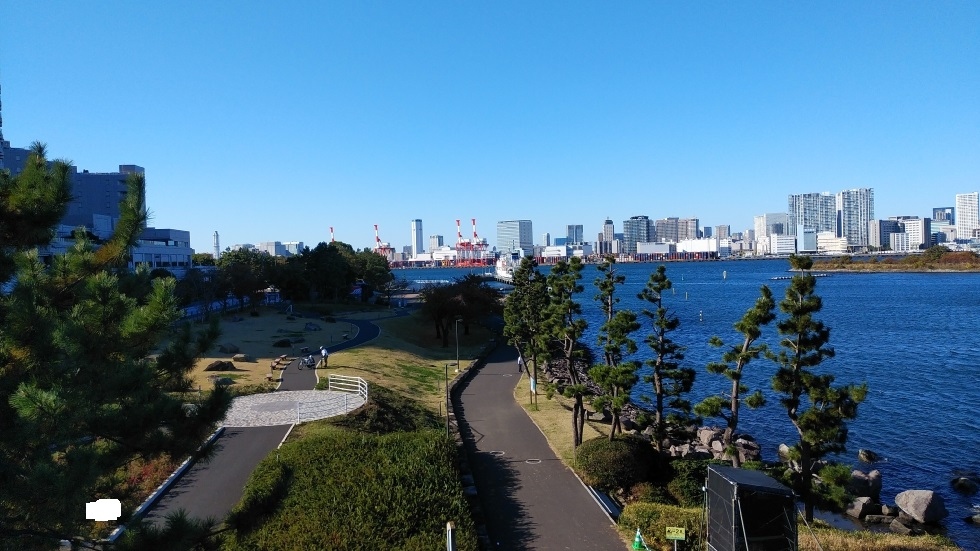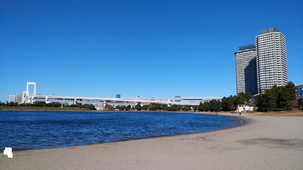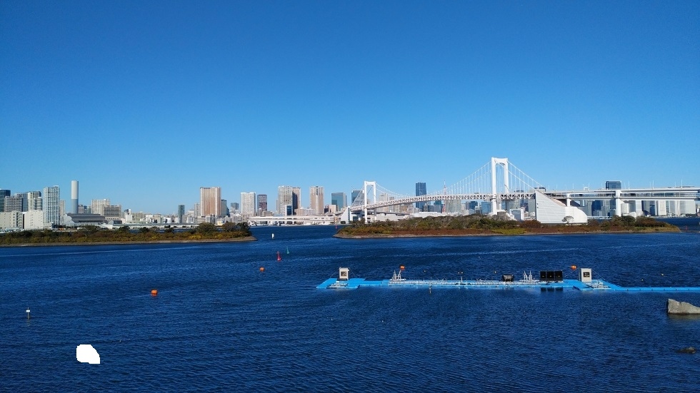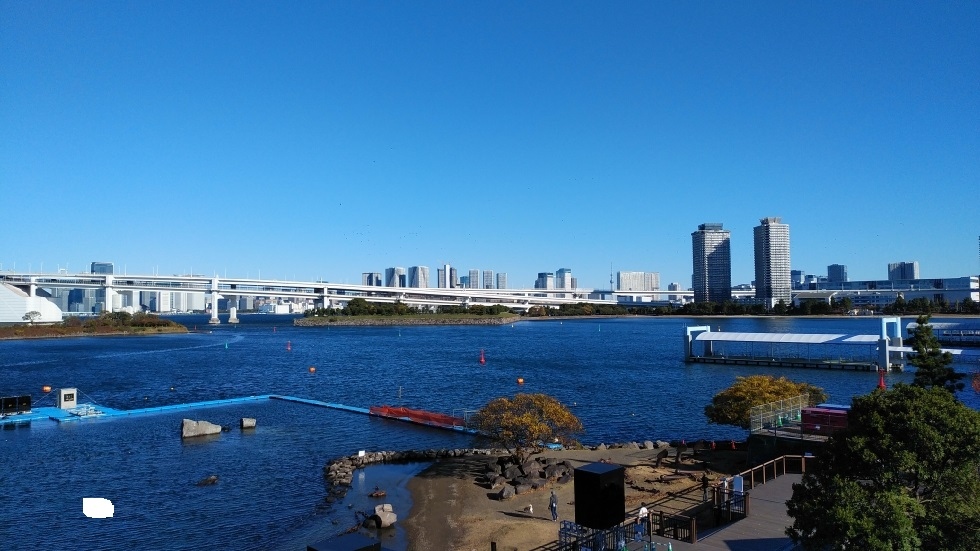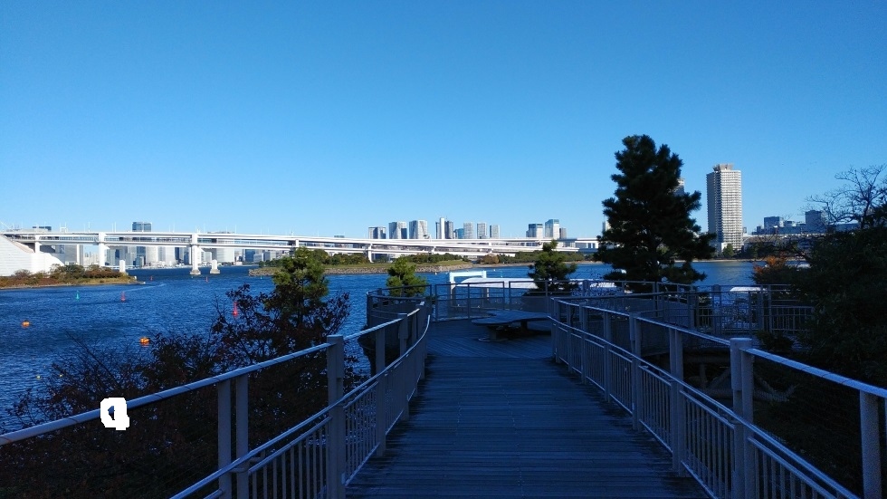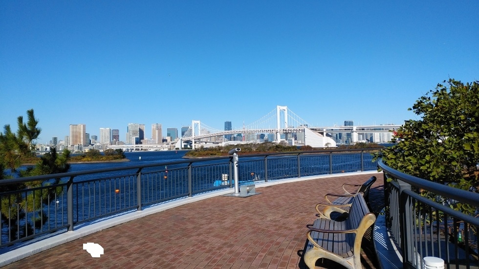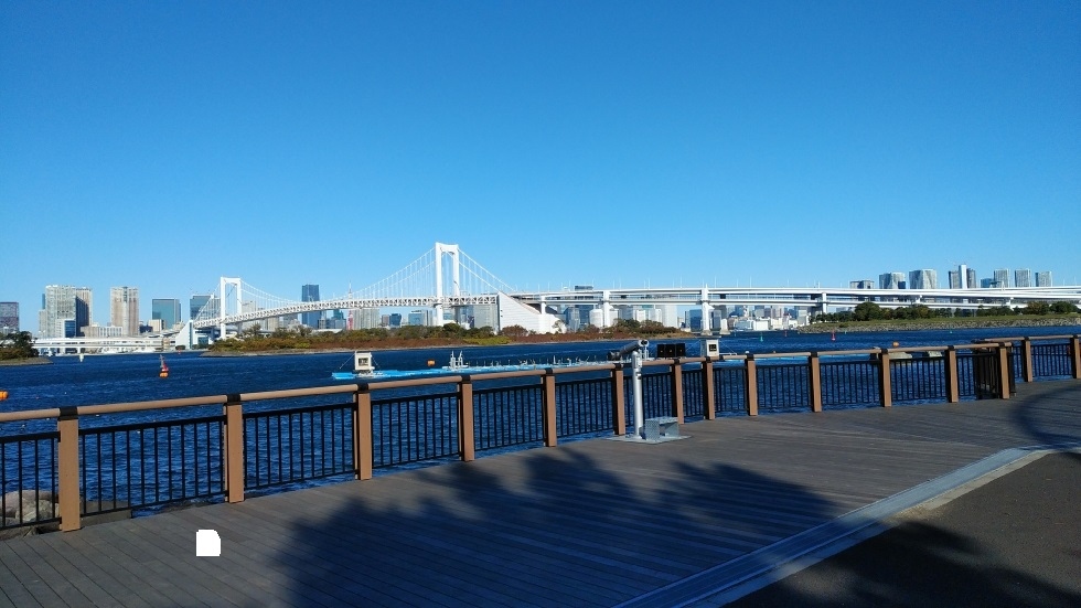 お台場駅から海に向かってすぐのところにある展望デッキ。海を挟んでの高層ビル群やレインボーブリッジ、東京タワーといったスポットを眺めることができる。大都会東京ならではの風景であると同時に、海越しに見える点が特徴的。