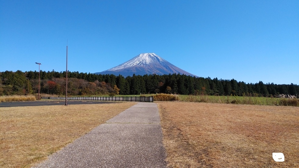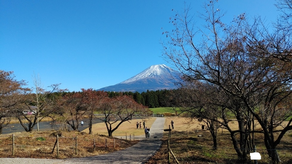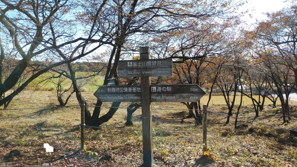 道の駅朝霧高原裏手にある展望台。わずかな丘の地形になっており、正面に大きく富士山を見ることができた。なお、眺望としては丘をおりた芝の広場のあたりから見える富士山の方が遮るものがなく、きれいに見えると感じた。富士山の眺望と合わせて紅葉も見ることができた。