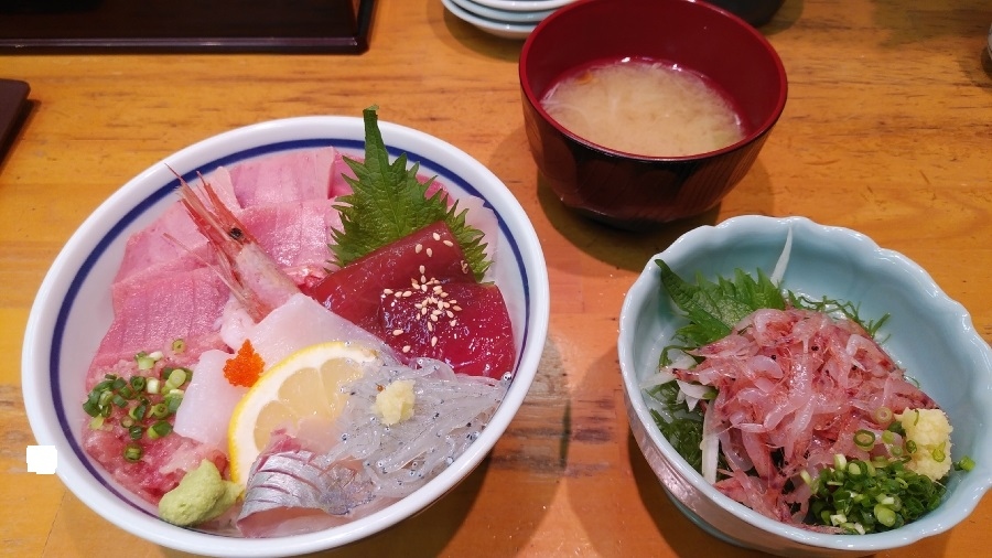 平日午後の時間帯ながら場内は活気があり、地元の人々のほかツアー客などの姿も見られた。飲食店も併設しており、地場のネタを味わうことができた。