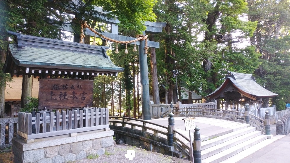 下諏訪駅から徒歩25分くらいのところにある神社。創建年代は不詳だが、1500年から2000年の歴史があるとされ、日本最古の神社とされる。こちらは最初の遷座地とされる。