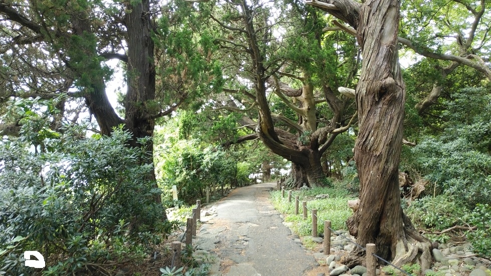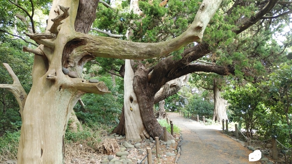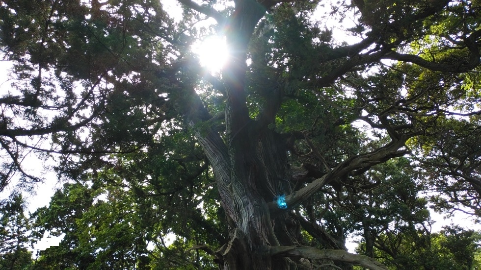 大瀬神社の境内に群生している樹林。環境的な影響か根や枝の張り方が特徴的で、たくさんの巨木は迫力があった。自然に自生しているのは珍しいとのことで、樹林としても日本最北端と貴重な景観を見ることができた。神社の境内に自生する木々ということもあり、神々しさも感じられるスポットだった。