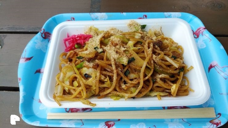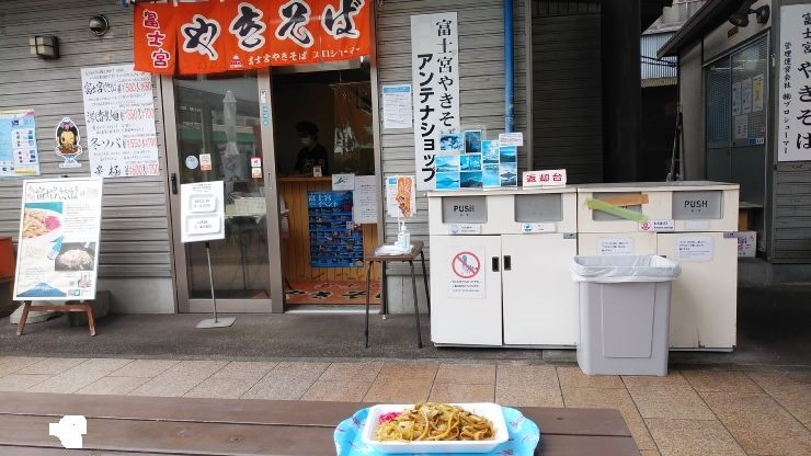 テイクアウト専門で、店の前にあるテーブルでいただくことができる。富士宮焼そばはややコシのある麺に削り節を加え、ソースと魚介の削り節の風味が合わさるのが特徴。野菜の具も多めでシャキシャキしていた印象。混み具合にもよるが、少しの待ち時間でご当地名物を味わうことができた。- 旅行時期