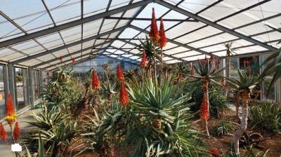 店舗に隣接するハウス内にアロエを多く栽培。周辺にもアロエが植栽されており、花を咲かせていた。
