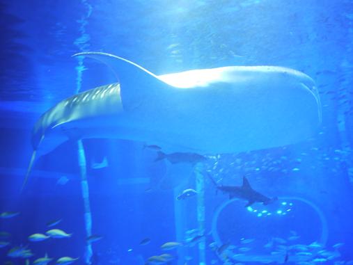 ジンベイザメ館 青の世界は、らせん状のスロープを下りながら、さまざまな角度で
