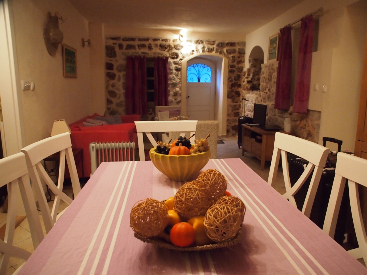 小さなゲート入ってすぐの所にあります。 レンタカーで行きましたが 北のゲートの城壁の外に 無料駐車場もあり スーツケースを転がしても 2~3分。かなり便利な場所にあります。お部屋は改装したてで とても美しく 2階にベッドルームが二室、それぞれに バス、トイレ付き。一階のリビングダイニングにも トイレがあります。