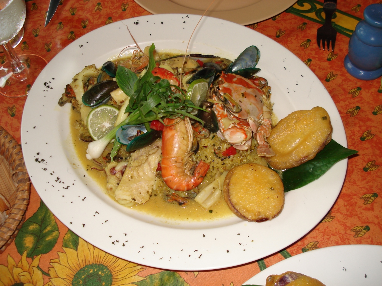 メコン川沿いに位置する地中海仏料理店「コート・ダ・ジュール(Le Cote D\\\'Azur Restaurant)。ブイヤベースなど南仏料理を中心に大勢でシェアしながら食べるのが良い。高級感はそれほどないが家庭的雰囲気がなかなか良い。