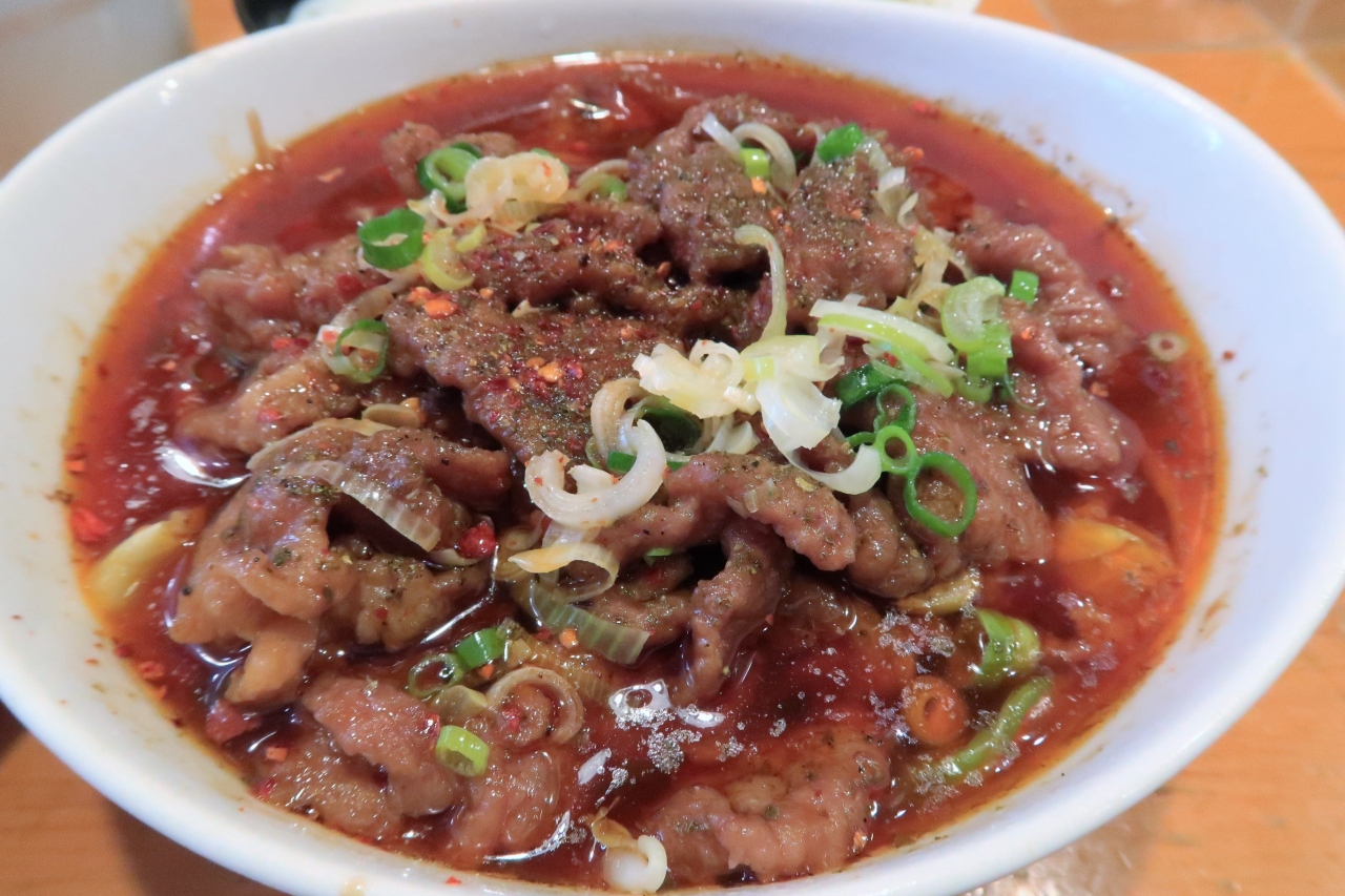 ●水煮牛肉 浅めの丼は牛肉で覆われ、下にはたっぷりのもやしとキャベツ。辛味と痺れ感のあるいい香りが漂います。牛肉は粉をはたいてありツルリとした舌触りで、硬そうに見えて意外と食べ易いやわらかさ。少し濃いめでピリ辛感のあるスープをたっぷり纏い、旨い。これはご飯が進みます。もやし、キャベツのシャキシャキした食感の変化や、途中で食べるサラダ、スープで一度口の中をリセットできるので、再度牛肉に向かえます。平日なので少し食べやすくしているように感じましたが久しぶりに美味しいピリ辛四川料理が頂け満足です。- 旅行時期