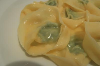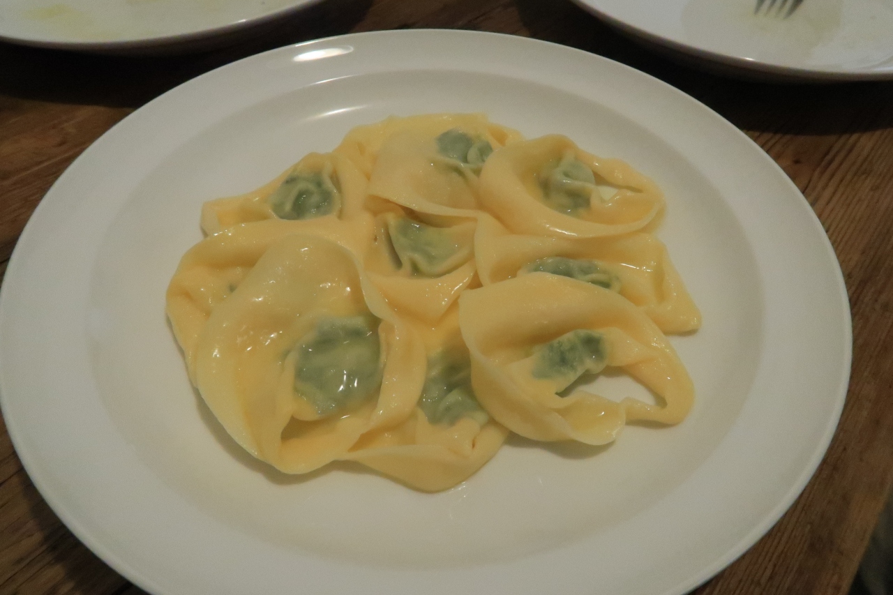●トルッテローニ(具 三種のチーズとほうれん草 ソース:セージバター) 一口で食べるよう勧められその通りに頂きます。噛むと平打ち麺より少し歯ごたえがあり、チーズとほうれん草の風味が広がります。ただ味付けは非常にあっさりで、セージ風味のバターで味わうといった趣。ソースの味で誤魔化しが効かない洗練されたパスタですね。
