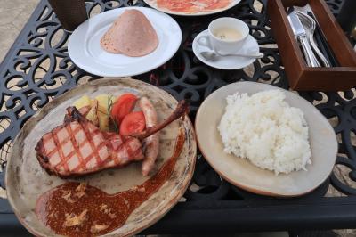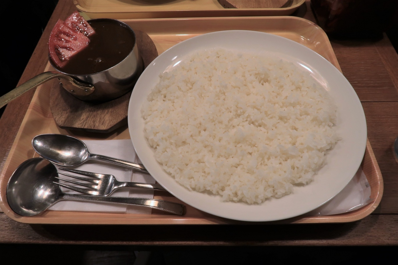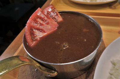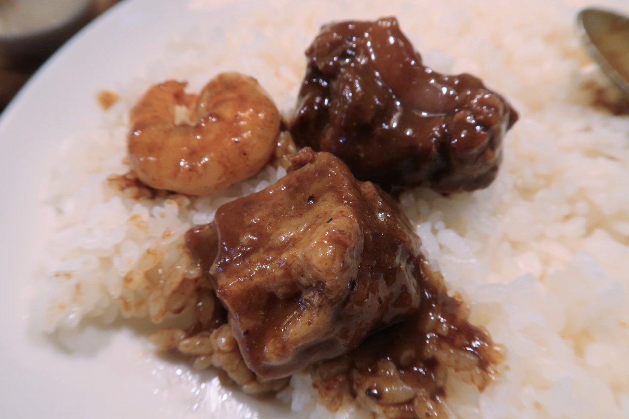 ●ミックスカレー 具はスペアリブ、ビーフ、小エビの3種。一口頬張ると塩分、辛みも控えめですが、濃厚なコクを感じます。ただ食べるほどに、スパイスがじんわり効いてきます。途中のトマトでフレッシュな酸味で口に中がリセットできますが、最後は口の中がヒリヒリ。具は全て1口サイズで食べ易く美味しいですが、カレーに具材(もしくは炒め玉葱)の旨味がもう少し欲しいなあという印象。