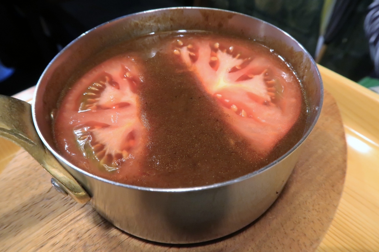 ●まぐろのステーキ 本日は鮪の顎肉。ソテーはフライパンでし、提供する際にタジンを使ってリンゴのチップで燻製の風味漬け。身はジューシーでしっかりとした食感。噛むと口の中に旨味が溢れます。山葵とオリーブのタプナードは味を引き締め美味しかったです。