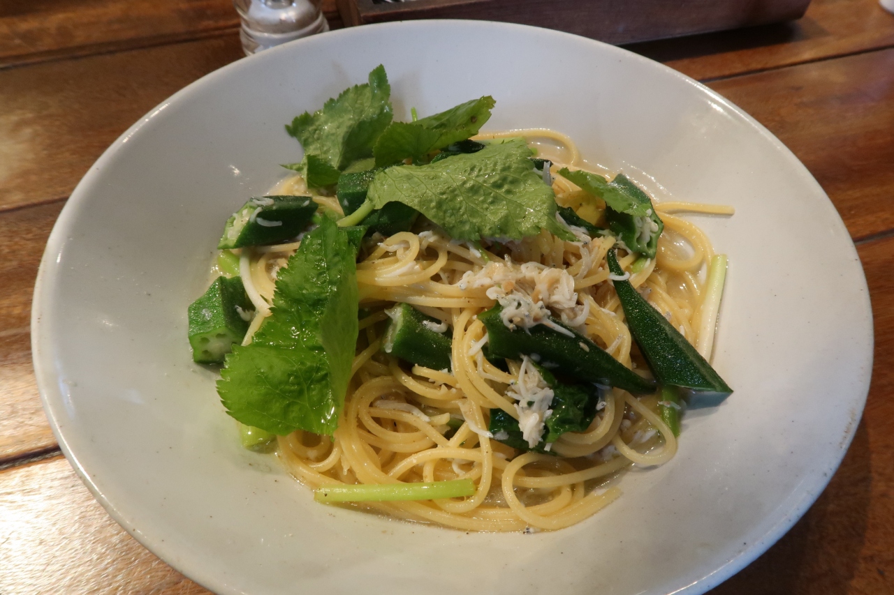 ●魚介と野菜のオイルソーススパゲッティ しらす、せり、オクラのパスタ。見事に乳化したソースにしらすの旨味が加わり美味しいですが、いつかどこかで食べたようで味としては普通。