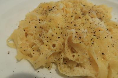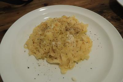 ●オリーブオイルとパルミジャーノチーズ、コショウのみのパスタ 薄い平打ち麺で、ヒラヒラとしたやさしい口当たり。味付けはパルメジャーノチーズの塩味と香りのいいオリーブオイルのみで純粋に麺の歯ごたえや粉の美味しさを味わえました。