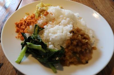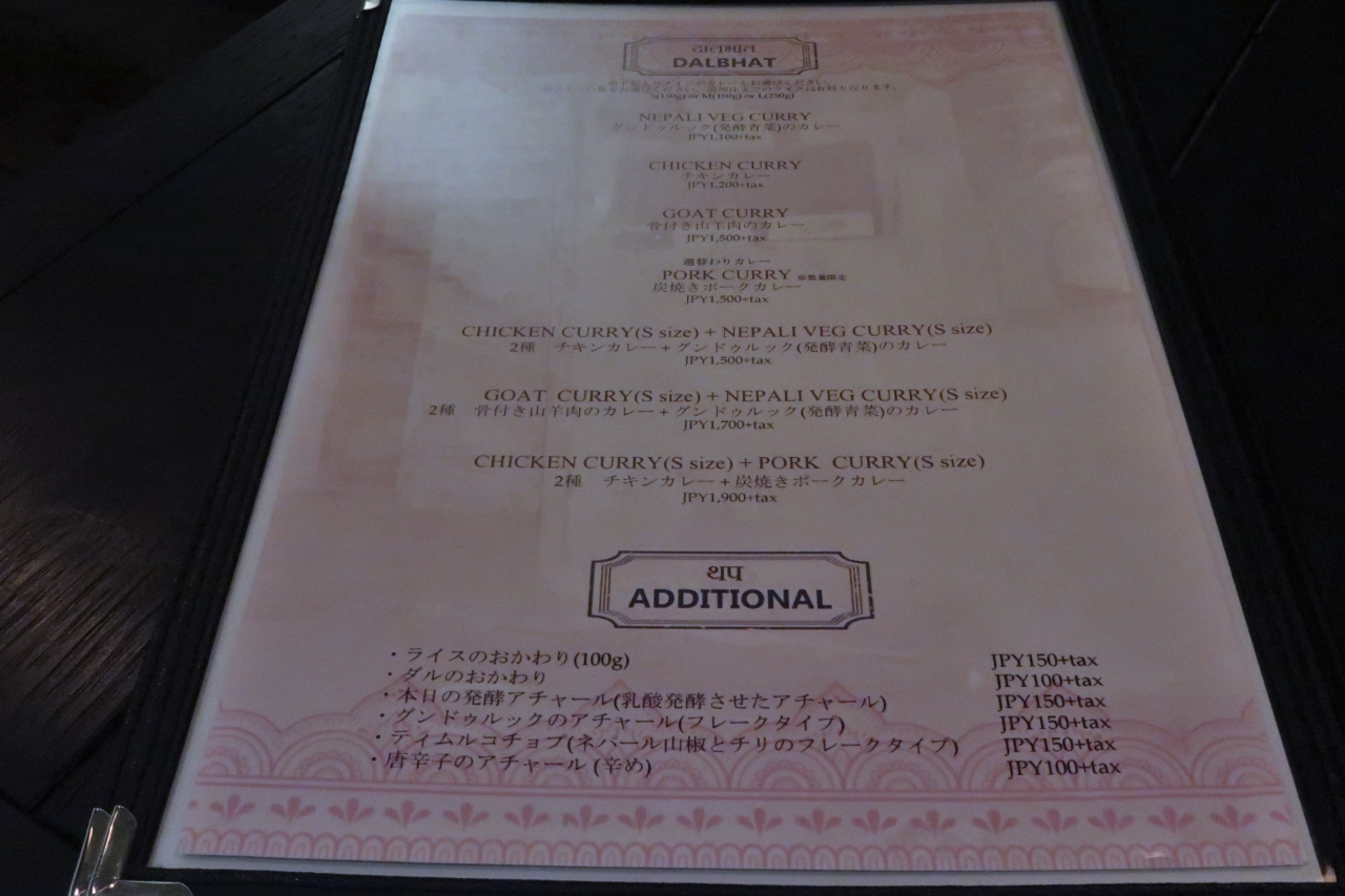 ランチはダルバートのみで、当日の選べるカレーは4種。その中から1種もしくは2種選択し+オプションという形です。相方とそれぞれ別の2種カレーを注文。