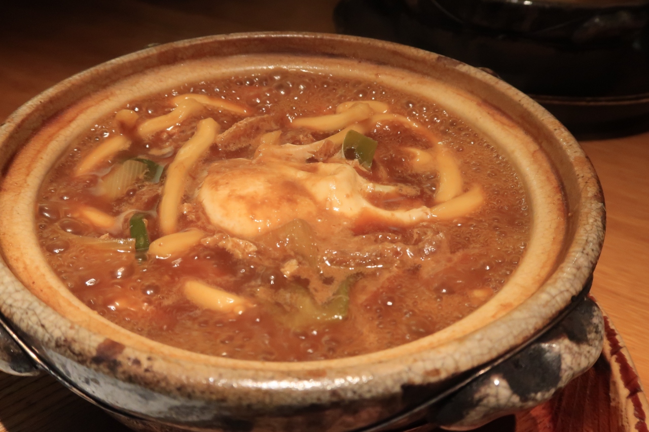 ぐつぐつ煮えた状態で提供されます。見た目は味が濃そうに見えますが鰹出汁がしっかりしており、八丁味噌の塩味、甘み、コクがいいバランス。うどんは噛むほどに小麦の風味を感じ、煮えていてもコシは十分あり美味しい。汁との絡みもいいですね。具材は鶏肉、卵、揚げ、長葱で、少し少なめ。卵を崩すと黄身がとろりとうどんに絡み一層美味しく、最後まで飽きずに頂けました。やはりこの季節、煮込みうどんはいいですね。- 旅行時期