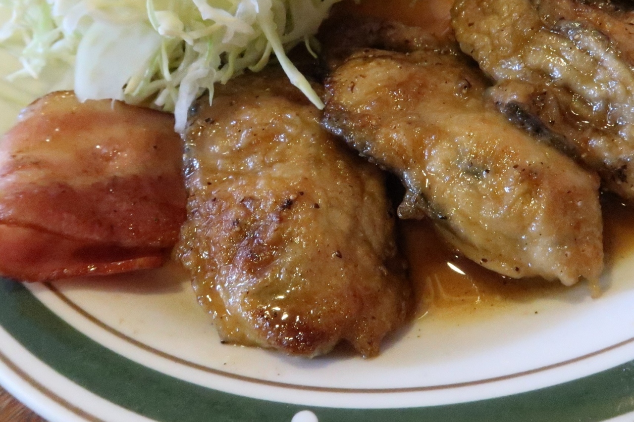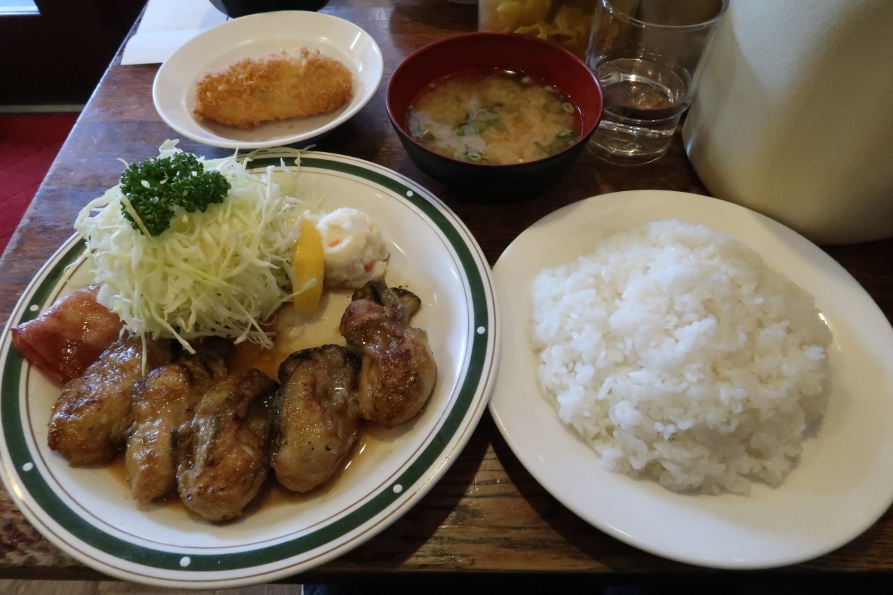 ●牡蠣バター焼定食 大船渡産の牡蠣5個とベーコン、山盛りの千切りキャベツ、ポテサラ付き。バターのいい香りが漂い、噛むと牡蠣の旨味とバター、醤油の風味が口内に広がり見事なハーモニー。そのバランスが絶妙で病みつきになる美味しさ。