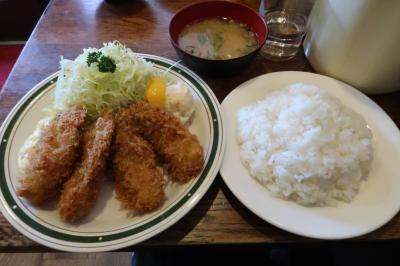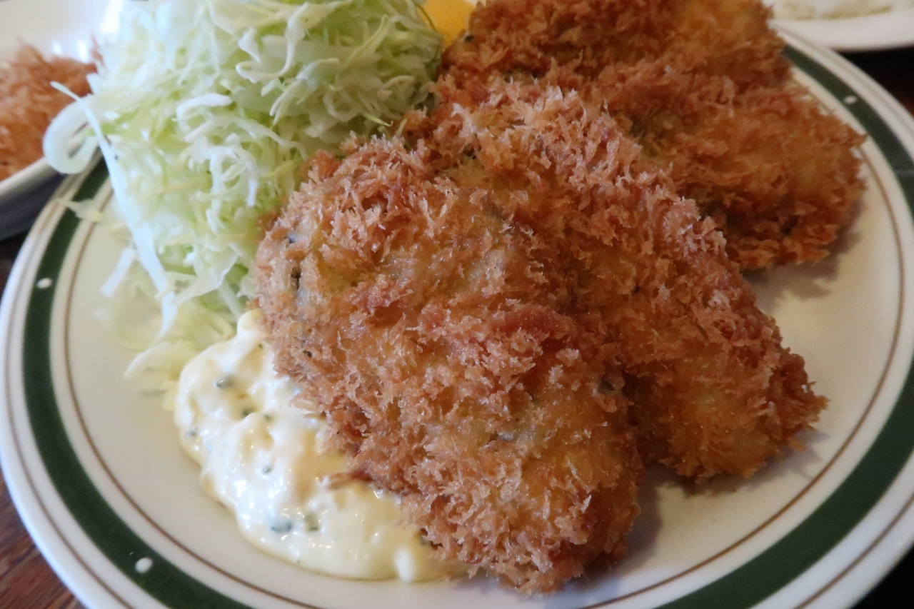 ●牡蠣フライ定食 こちらも大船渡産。大きなものが4個でタルタルソースが付き他は同じです。カリっと揚げられた衣は香ばしく噛むと牡蠣の旨味が溢れます。タルタルソースとの相性は言わずもがな。旨いですねぇ。