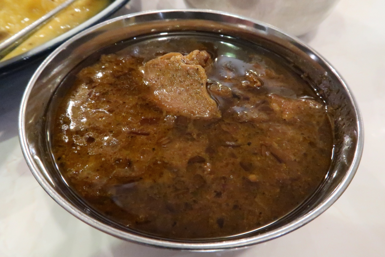 ●骨付き山羊肉カレー たっぷりの骨付き肉で食べ応えあり、噛むとしっかりとした肉質で独特の味わい。他のカレーより深いコクがありカレーというよりはシチューのような印象。