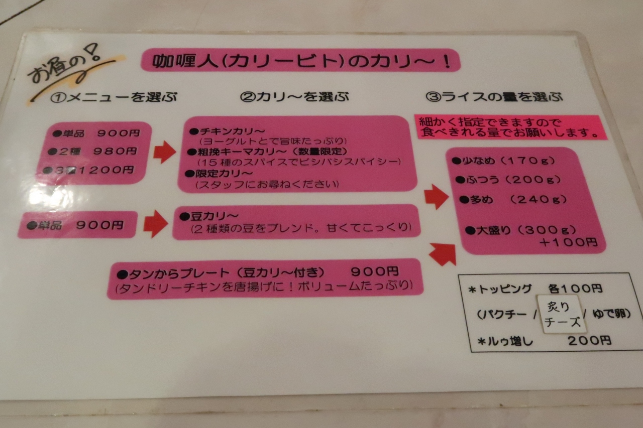 平日ランチで伺いました。開店10分前の11時20分着で、すでに6人待ち。アルコール消毒をして券売機で購入。店内はカウンターのみで1度に9人が入店できます。注文したのは3種カリー(1200円)とキャベツのアチャール(別途200円)。