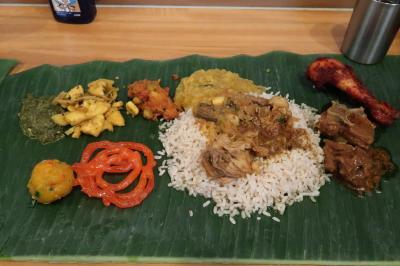 ランチは11時から始まり、2巡目、12時入店。カウンターの2人席がありそこに着席。すでにバナナリーフが敷かれており、ホールの方が順番にサーブして周ります。当日の献立は…