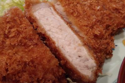 ●加藤ポーク ロース豚カツ(厚切り) 200gあるロースカツはさすがにボリューミー。断面を見てもジューシーなのが見て取れます。揚げ上がりはサクっと香ばしく、厚切りでも歯で噛みきれるやわらかさ。口に豚肉の旨味が広がります。ただそれにも増して、脂身のジュワーと溢れる甘みはさすがブランド豚といったところ。