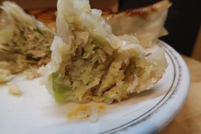 ●餃子 大きいという認識はありましたが、実際見ると写真で見る以上にデカイ。薄めの皮は香ばしく焼かれ、見た目にも旨そう。噛むと餡がぎっしりですが、にんにくとニラが使われていないのであっさりしており野菜の甘みが広がります。なので大きいですが食べやすくパクパクいけます。ただ餡はジューシーという感じではないので、その点は少々物足りないかな。いつものように酢+胡椒、酢+辣油で食べすすめますが、さすがに後半は食べ飽きてきて醤油や、唐辛子ペースト(?)なども加え味変を楽しみながら完食。