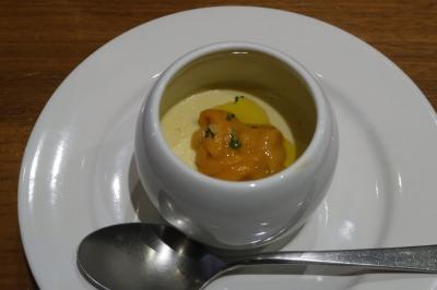 ●とうもろこしのムース 生うに添え 舌ざわりが良いムースは、とうもろこしの甘みが十分引き出されています。うにの磯の風味、塩味が味を引き締め美味しい。
